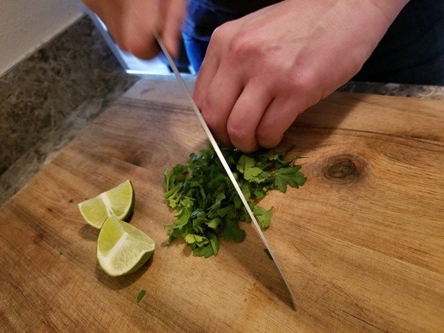 As the broth slowly approaches a boil, chop up the cilantro. Cut the lime into a few wedges.