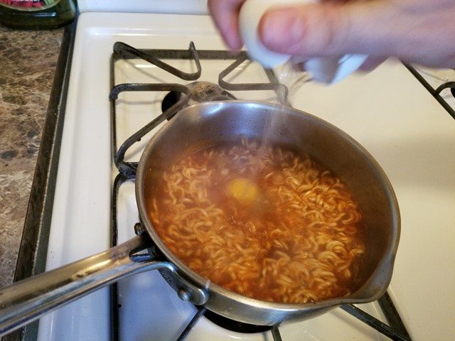 As the ramen simmers, add the cheese and egg while stirring to scramble the egg in the pot. The cheese will melt and the egg will cook, just be sure to keep stirring until both are distributed evenly.