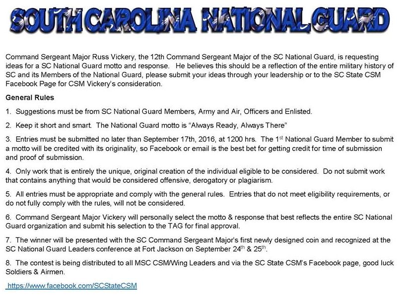 Do you even internet, bro? Awhile back, the South Carolina National Guard put out a request for folks to come up with the command’s new motto (because apparently “Trusted at home, proven abroad” is no good). Here were the guidelines: