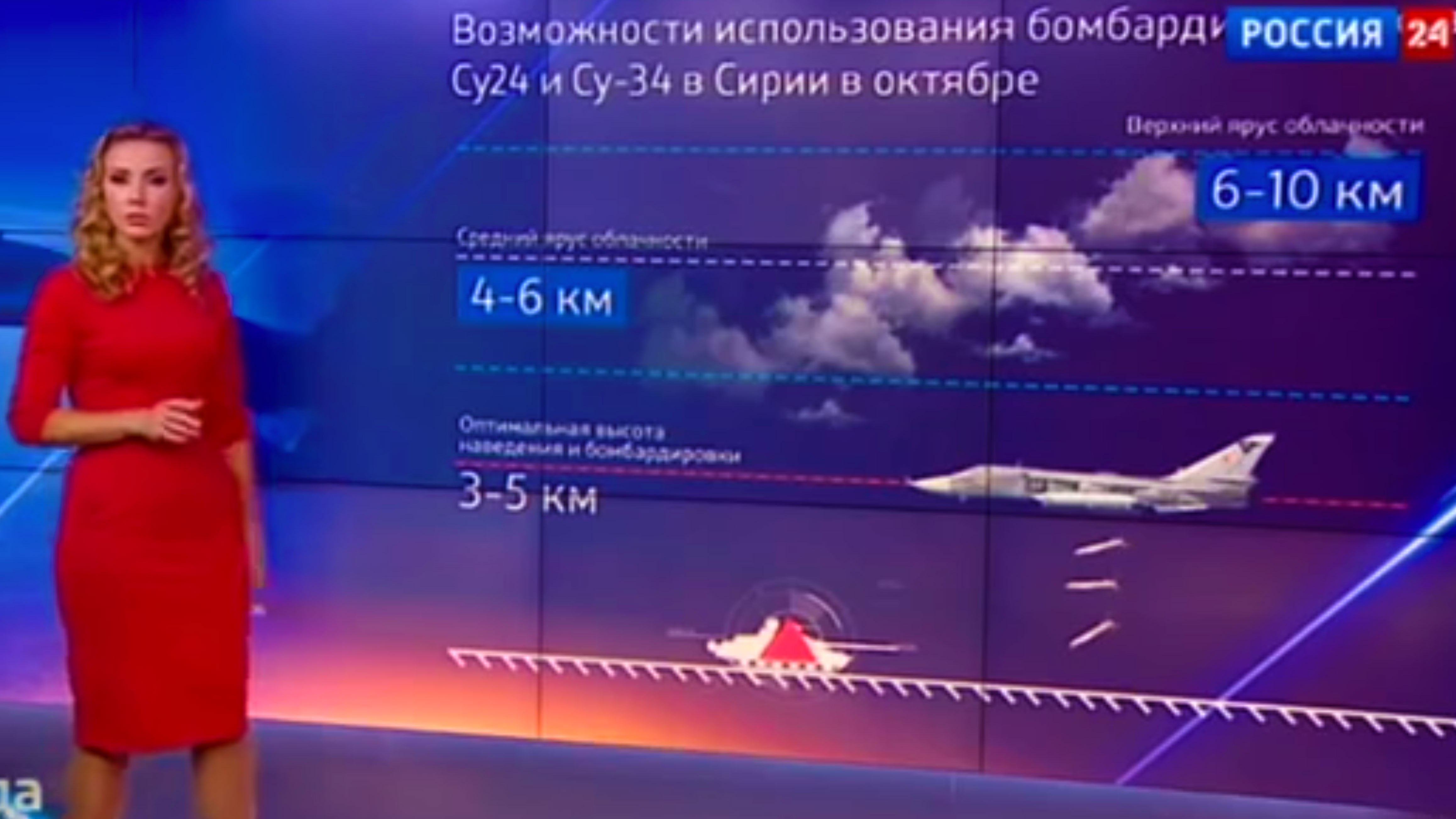 “In these meteorological conditions, planes can dive below the clouds and conduct effective strikes on ground targets, and only climb higher if there’s active anti-aircraft fire,” Grigorova said in front of a graphic depicting a Sukhoi Su-24 strike aircraft dropping bombs on an enemy tank from the “optimal height for targeting and bombing” of three to five kilometers off the ground, according to the translation from The Guardian.