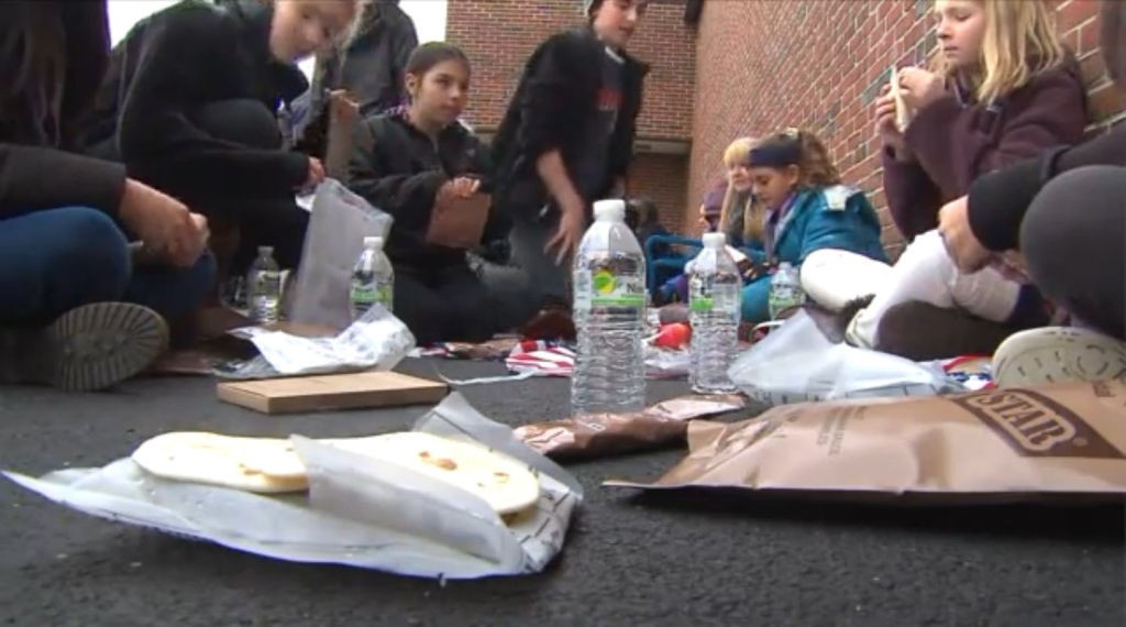 The school went for the authentic experience, with students heating their meals using chemical pads and eating on the ground outside.