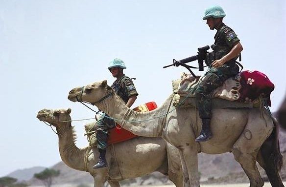 In the above photo, Dutch soldiers assigned as peacekeepers ride camels while enforcing a 2002 ceasefire between Eritrea and Ethiopia. The large deserts of Iraq and Syria could make mounted troops necessary if the UN decides to send personnel to the conflicts there.