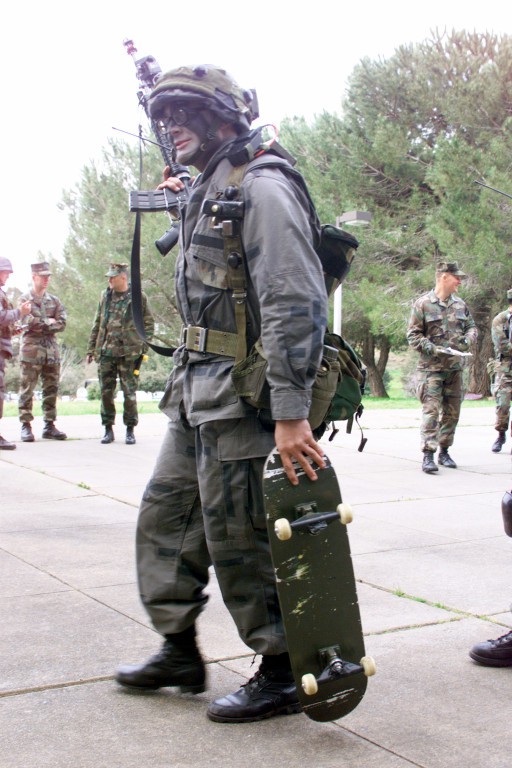 Skateboards were tested during Urban Warrior ’99 for potential use in detecting booby traps and avoiding sniper fire. Documents from the exercise don’t discuss how the “urban combat skateboard” was to be employed, but the boards never made it to full fielding.