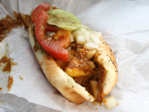 I don’t know whose mother-in-law this was named for, but I sure do like her style. To make a Chicago-style Mother-In-Law, Chicagoans use their local method of making tamales (a hot dog-shaped, meat-filled log made of cornmeal). The “tamale” is put on a hot dog bun and topped with chili and (sometimes) a pickle.