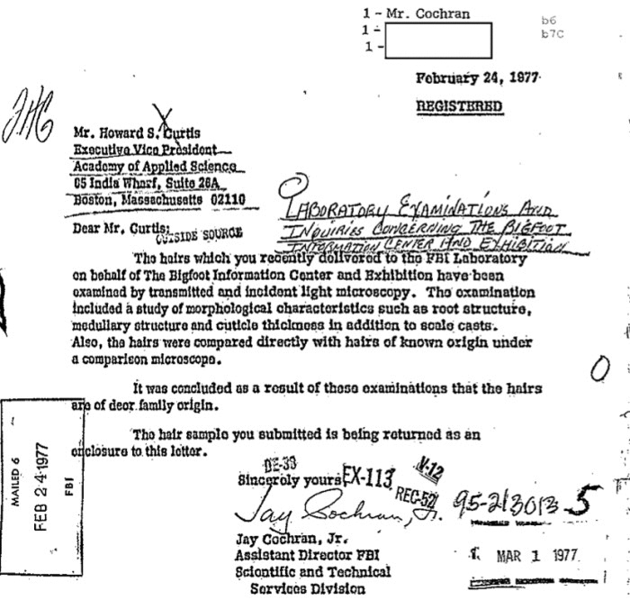 His letter was received by Jay Cochran Jr., Assistant Director of the FBI at the Scientific and Technical Services Division. Cochran started by explaining to Byrne that the FBI isn’t in the business of chasing down unusual hair samples from the woods unless there was some kind of crime involved, but, because of the unique scientific implications, he was willing to make an exception.