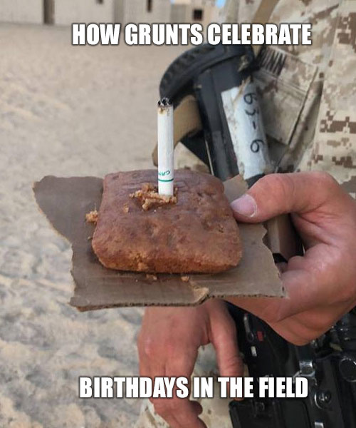 For everyone else (and those troops in the field or deployed) they’ll often just get a doughnut or the pound cake that comes in the MRE. Candles are optional but they’re occasionally cigarettes.