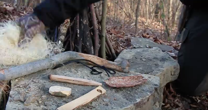 A small piece of flat wood that can fit inside the palm of your hand (the socket), a longer but thin piece of wood (the fire board), a wooden peg (spindle), a curved piece of wood, and a cord make up the bow-drill.