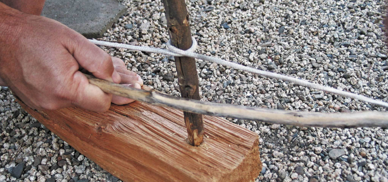 Fasten the ends of the cord to the tips of the curved piece of wood, then single-wrap the cord around the spindle. Place the tip of the spindle onto the fire board and start moving the bow-drill in a sawing motion while continuing to secure the spindle in your hand with the socket.