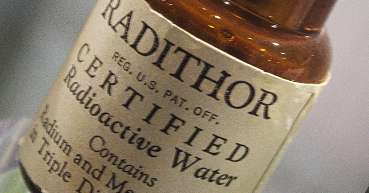 Radithor was a solution of radioactive radium salts and distilled water, advertising itself as “perpetual sunshine,” and a “cure for the living dead.” Its creator charged the modern-day equivalent of for every bottle and claimed it could cure impotence and mend broken bones, which would be ironic for one Radithor drinker, Pittsburgh businessman Eben Byers.