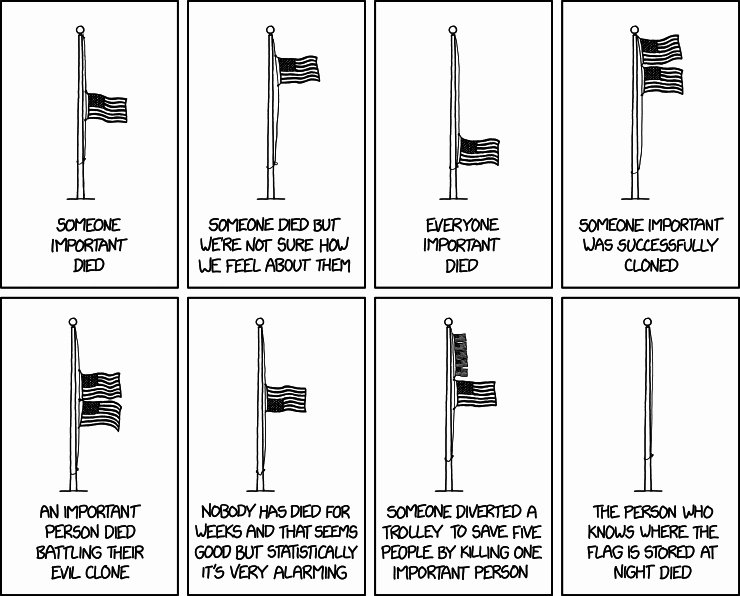 One final note: proper etiquette dictates that the flag must not just be raised to half-staff. “The flag should be briskly run up to the top of the staff before being lowered slowly to the half-staff position.”