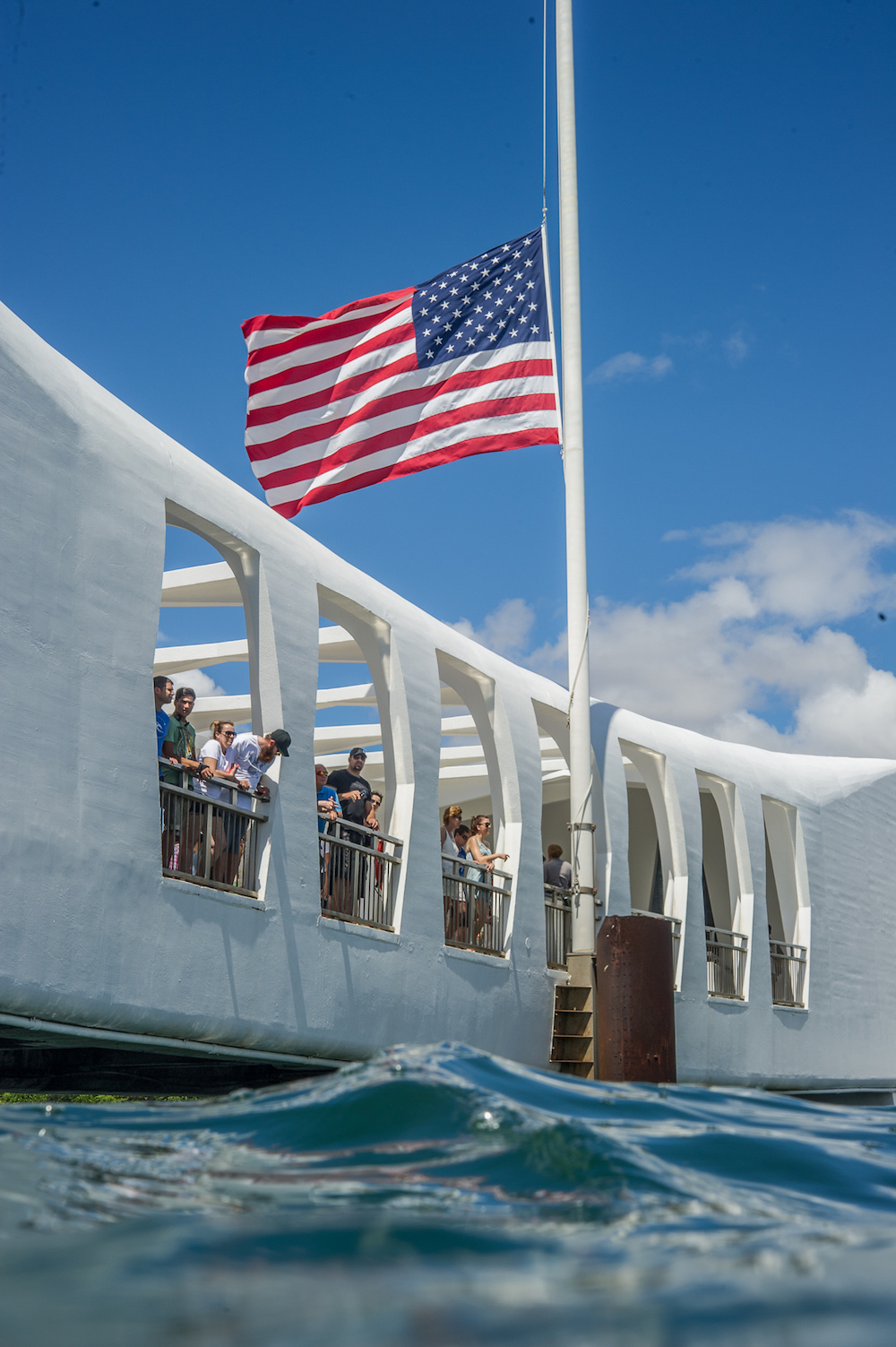 Visitors on the USS Arizona Memorial as the flag flies at half-staff.