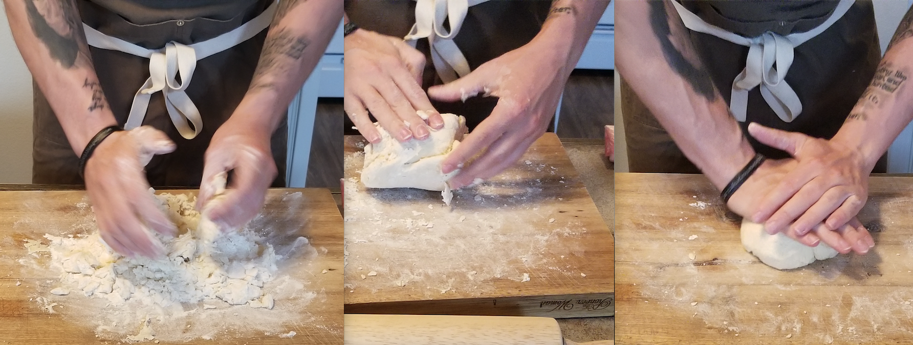 With a fork, mix together all ingredients while slowly pouring the pre-portioned water into the well. This is a very old technique that ensures the dough is brought together at the appropriate, gradual pace.