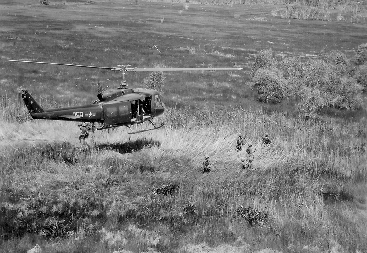 A helicopter deposits troops in the Mekong River Delta of Vietnam.