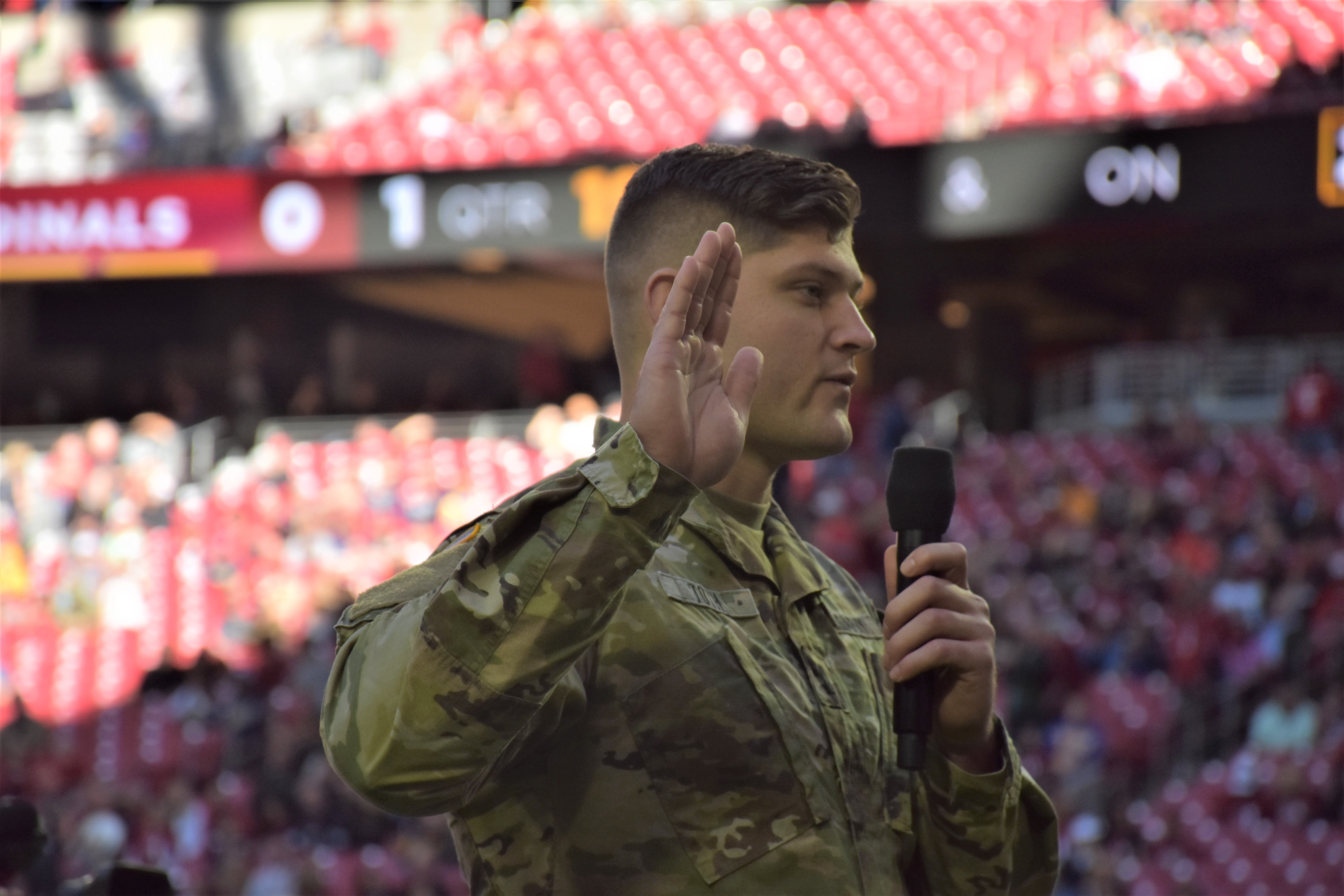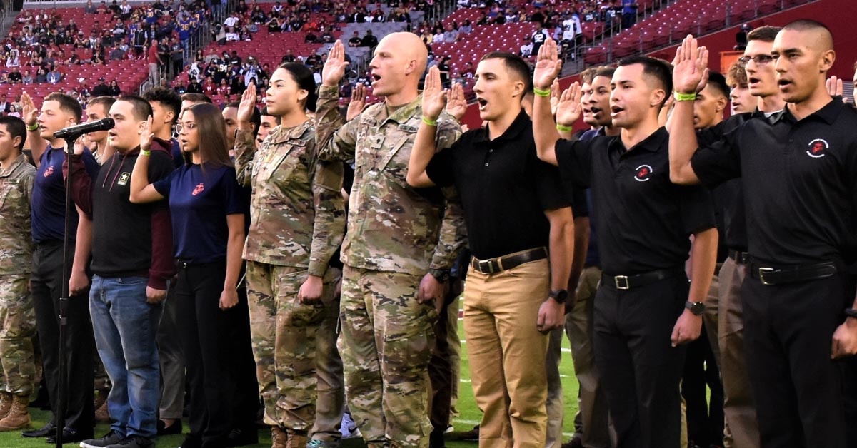 In the hours before the Arizona Cardinals kicked off against the Los Angeles Rams, an even more special thing happened in the Cardinals’ end zone. Unfortunately for the Cardinals, it was only one of two events that took place in their end zone all night. Arizona fell to Los Angeles 31-9, but 45 U.S. troops were sworn in or reenlisted that night.