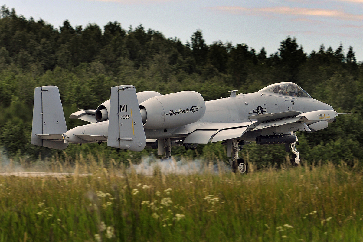 On a rural highway in northern Estonia, a pilot flies an A-10 Thunderbolt II from Lielvarde Air Base, Latvia, while practicing austere landings and take offs during the Exercise Saber Strike 18 on June 7, 2018.