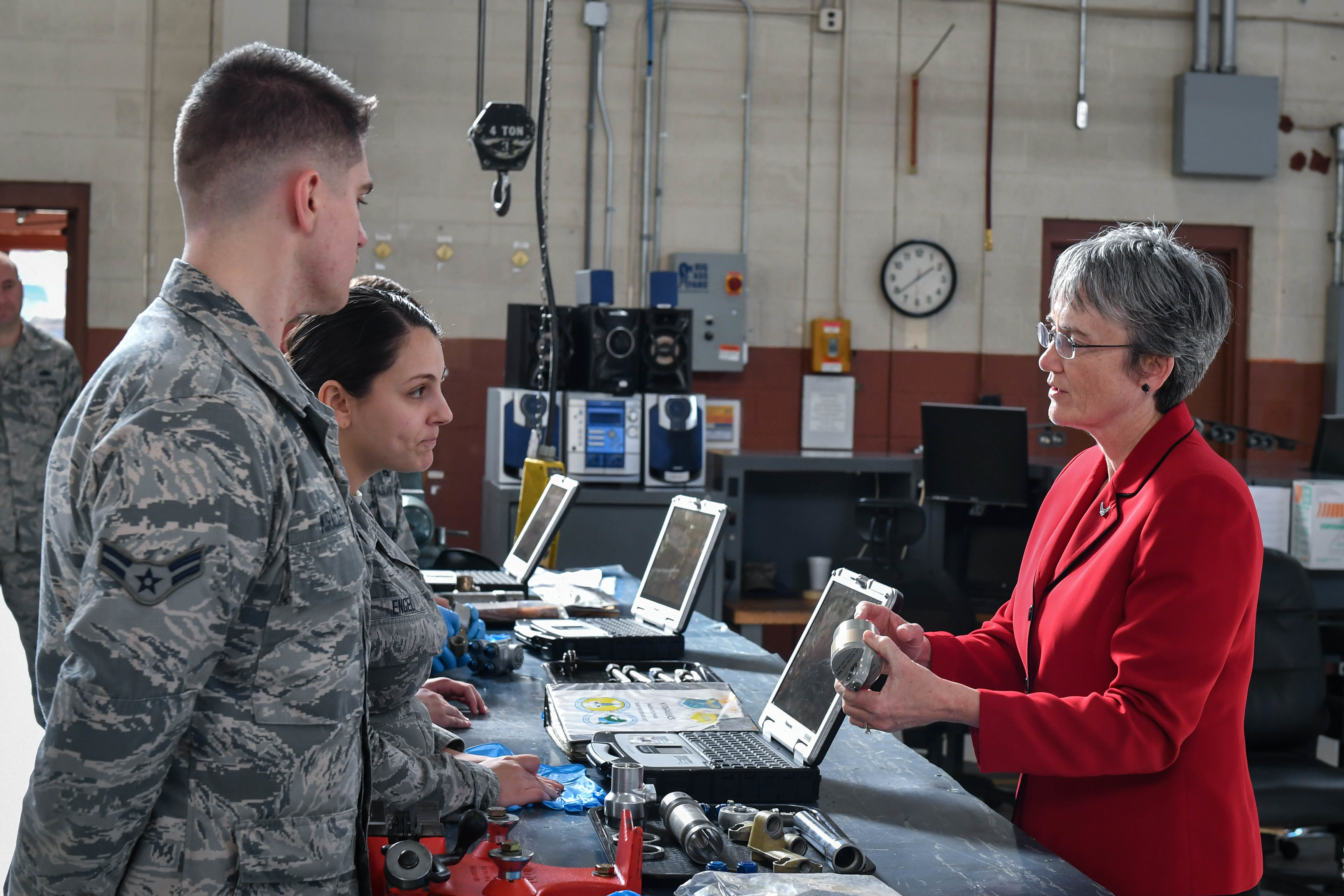 Secretary of the Air Force Heather Wilson speaks to 2nd Maintenance Squadron airmen during a tour at Barksdale Air Force Base, La., Nov. 14, 2017.