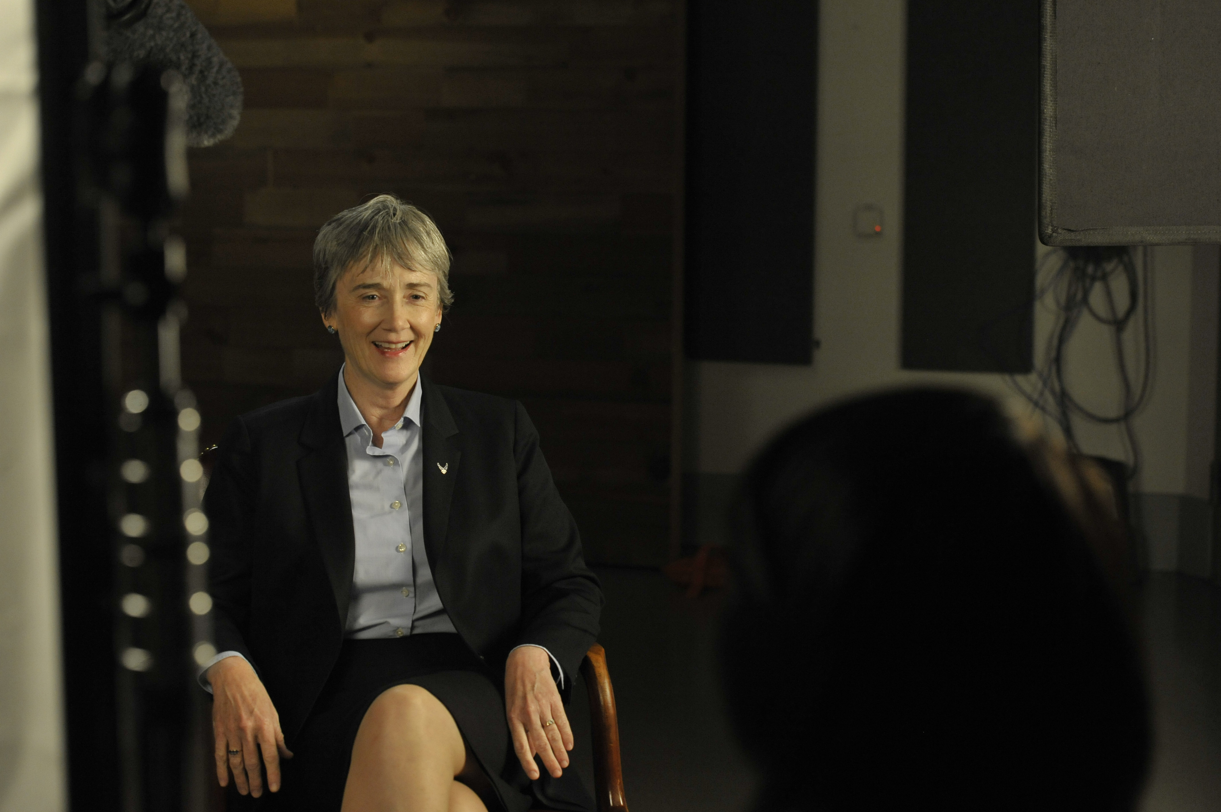 Secretary of the Air Force Heather Wilson speaks with airmen during a farewell interview at the Pentagon in Arlington, Virginia, May 8, 2019.