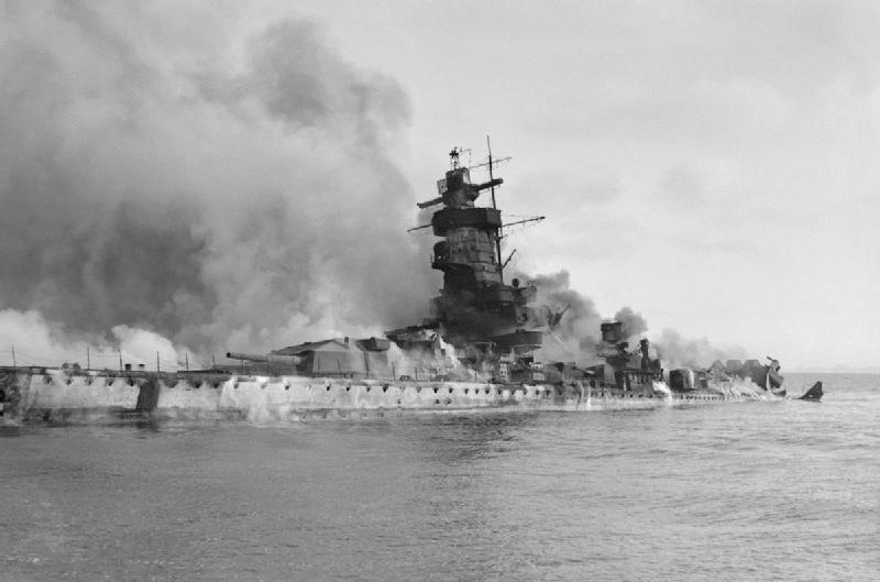 The HMS Legion, at left, rescues survivors from the slowly sinking HMS Ark Royal near the coast of Gibraltar.