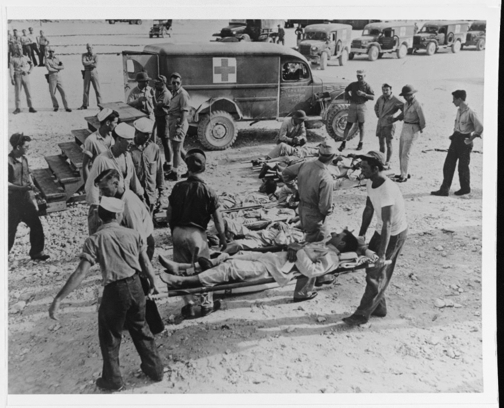 USS Indianapolis survivors are moved to the hospital in August 1945.