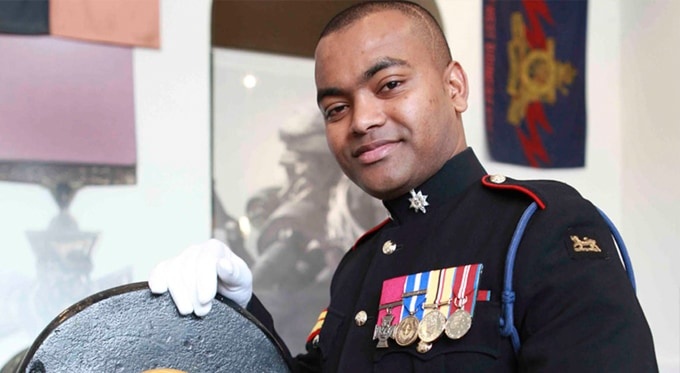 Lance Sgt. Johnson Beharry poses with one of two captured Chinese cannons used to create Victoria Cross medals.