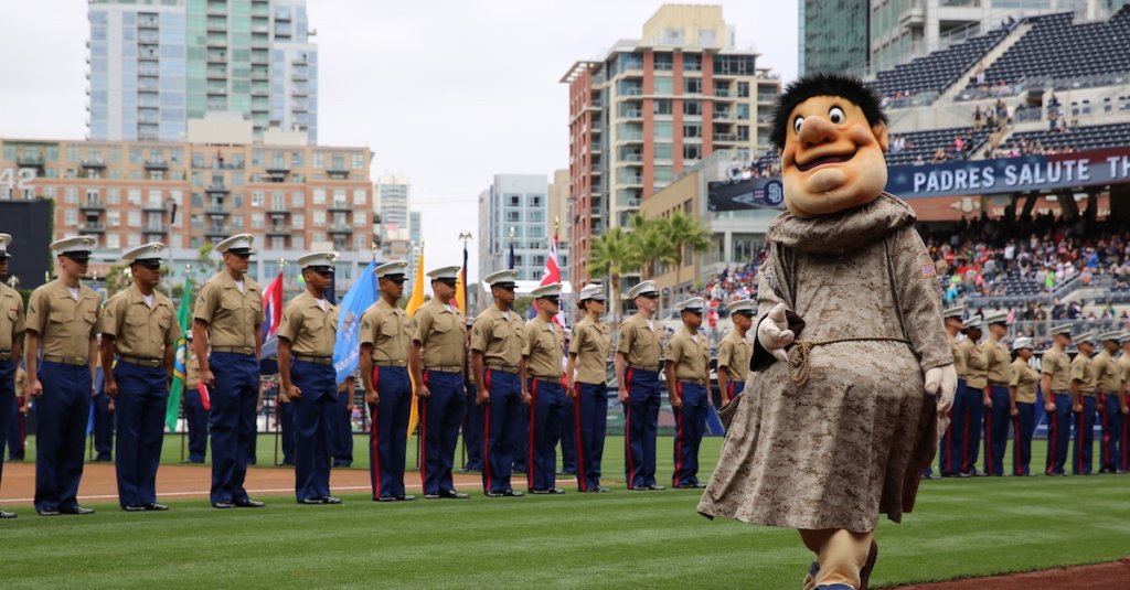 Padres’ mascot, the “Swinging Friar,” pumps up the crowd during the San Diego Padres Military Appreciation Sunday game opening ceremony at Petco Park, San Diego, April 13. (U.S. Marine Corps / Cpl. Benjamin E. Woodle)