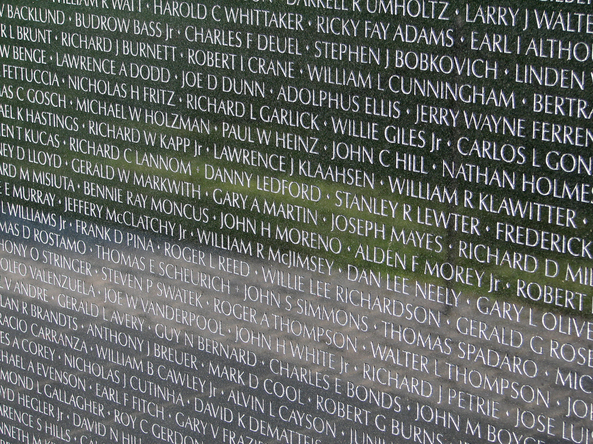 Known simply as “The Wall” to the men and women who can find the name of a loved one inscribed on it, the Vietnam Veterans Memorial Wall lists the names of those who fell during the Vietnam War. The names are arranged first by date, and then alphabetically. There are more than 58,000 names on more than 75 meters of black granite, memorializing those who died in service to that war.