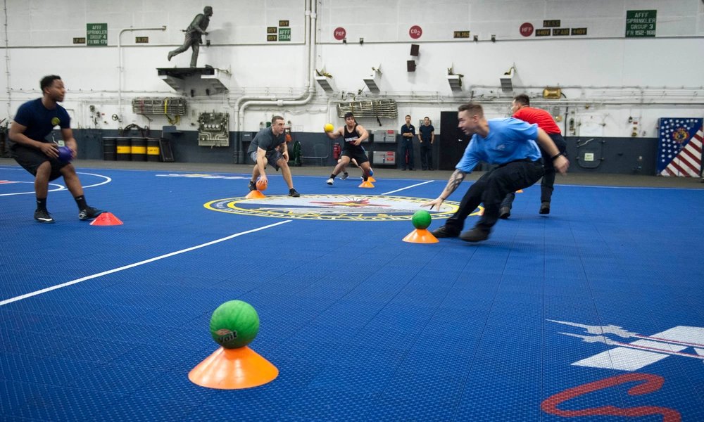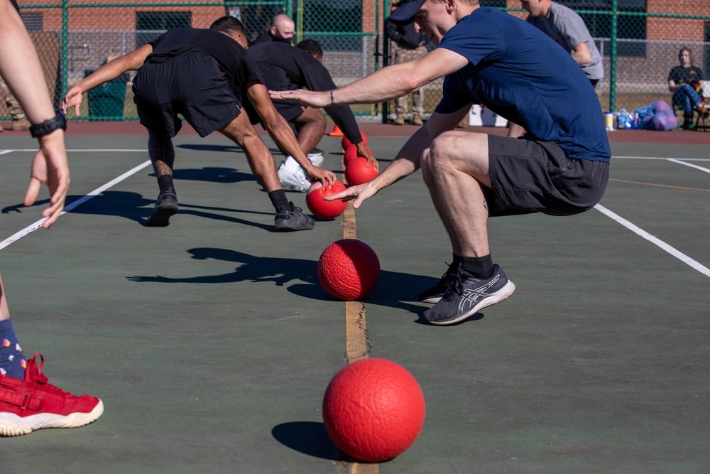 To successfully play dodge ball, throwers must throw the ball more than 40 feet across the court. This requires players to have shoulder, arm, back, and abs strength. Repeatedly throwing the dodge ball can help players build muscle endurance, making them stronger and more resilient.