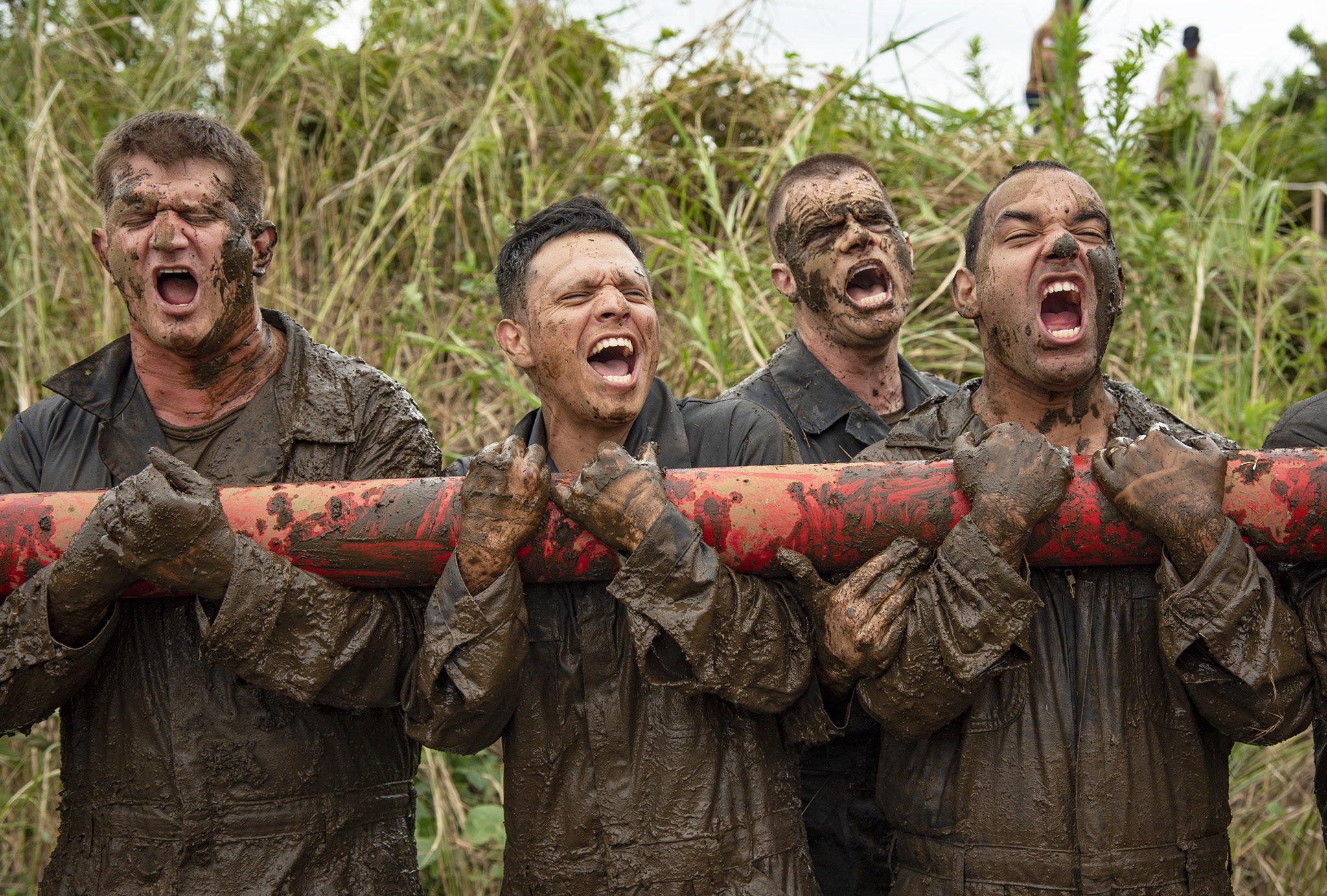 From left, Equipment Operator 1st Class John Owen, Aviation Structural Mechanic 1st Class Jose Esquivel, Aviation Ordnanceman 1st Class Michael Burke and Gunners Mate 1st Class Keean Durocher lift a motivator during a physical training (PT) session at Naval Air Facility Atsugi. The PT session was part of the final day of the installation’s CPO Initiation season.