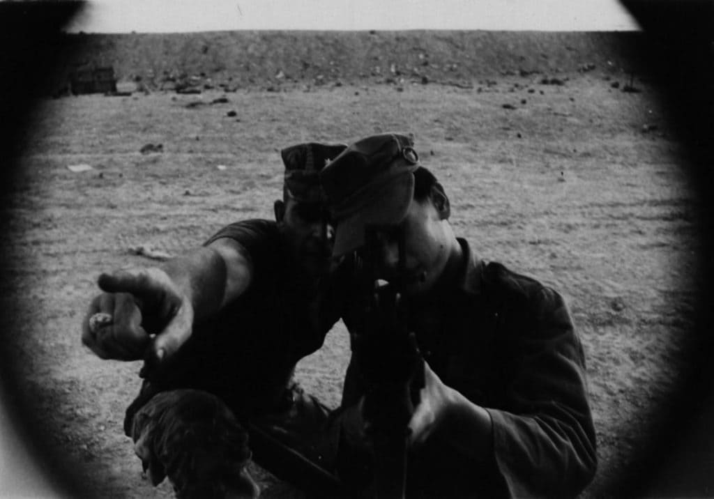 9. A soldier shot by a sniper smokes a cigarette as another soldier looks at the carbine magazine that caught the incoming round, preventing further injury.
