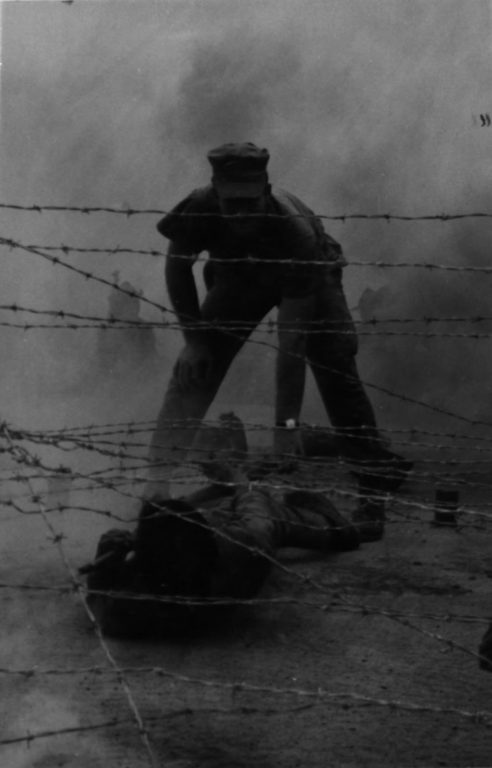 A Vietnamese Popular Force trainee is aided through a barbed wire entanglement on the infiltration course at Mobile Training Team-1 located just outside Tam Ky on July 28, 1968, by Sgt. William C. Gandy. (Photo: U.S. Marine Corps 1st Lt. Joe Collins)