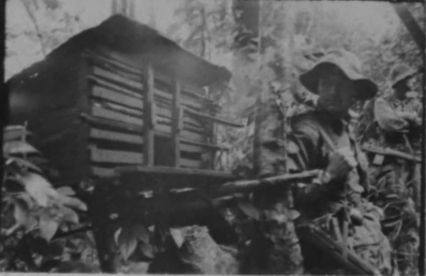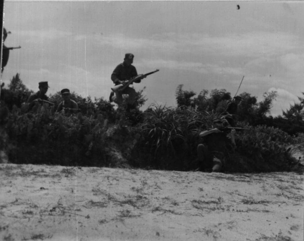 A Popular Force automatic rifleman and his assistant provide cover while a U.S. Marine advances and a Popular Force riflemen leaps over a row of cactus to pursue fleeing Viet Cong. The action occurred during a joint search and sweep operation near Chu Lai on Aug. 24, 1966. (Photo: U.S. Marine Corps Lance Cpl. Mincemoyer)