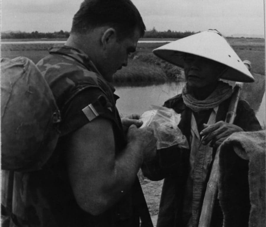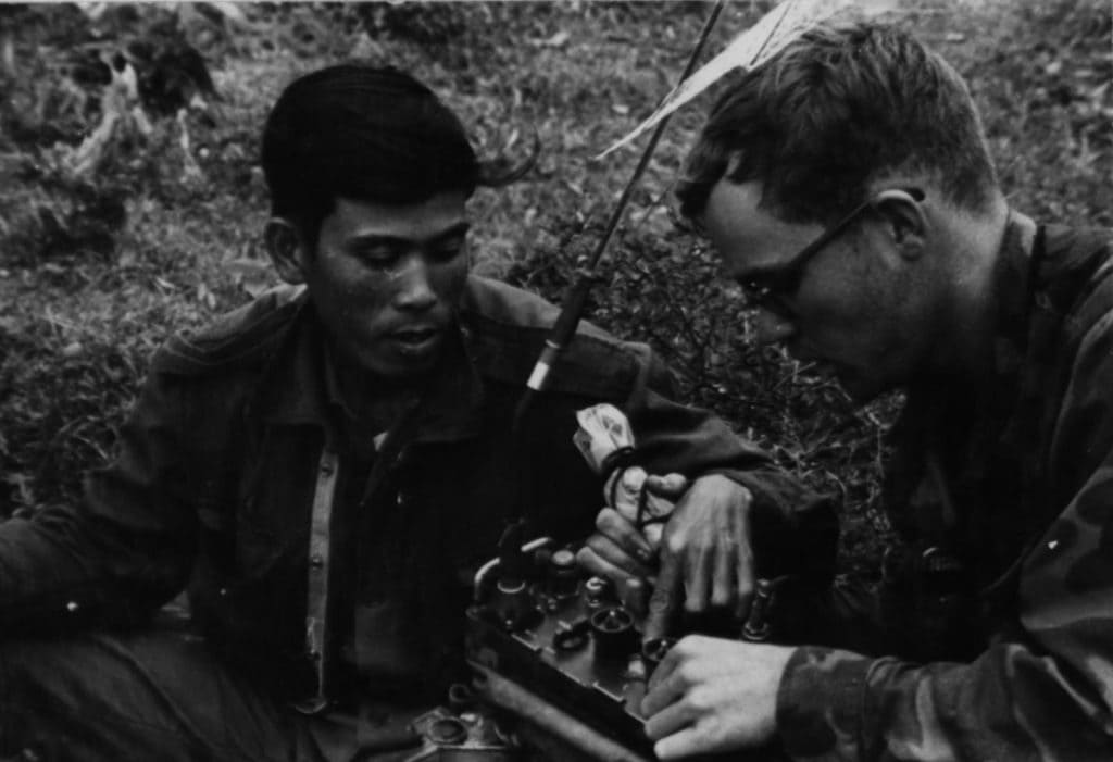 Marine Cpl. J. R. Stien gives a Popular Force soldier an instruction on the operation of the PRC-25 in late-November 1969. (Photo: U.S. Marine Corps Cpl. G. J. Voljack).