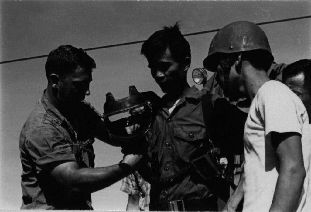 Marine Sgt. Lawrence J. Marchlewski instructs Vietnamese fire fighters in the proper use of their gas mask. The device allows firemen to combat flames in heavy smoke. (Photo: U.S. Marine Corps Sgt. G.W. Heikkinen)