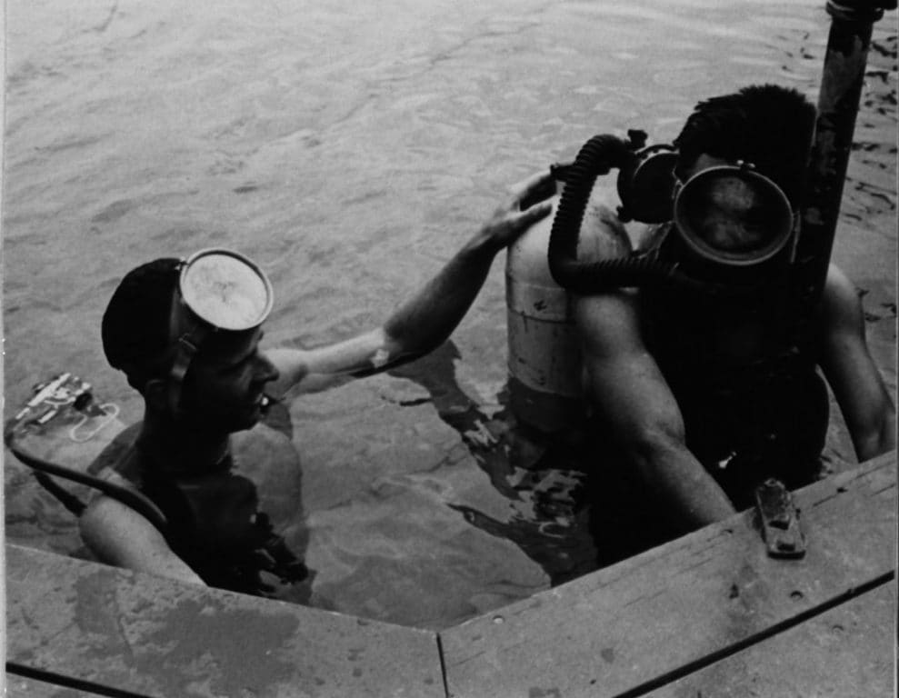 23. A Marine instructor helps a Vietnamese student after an underwater exercise.