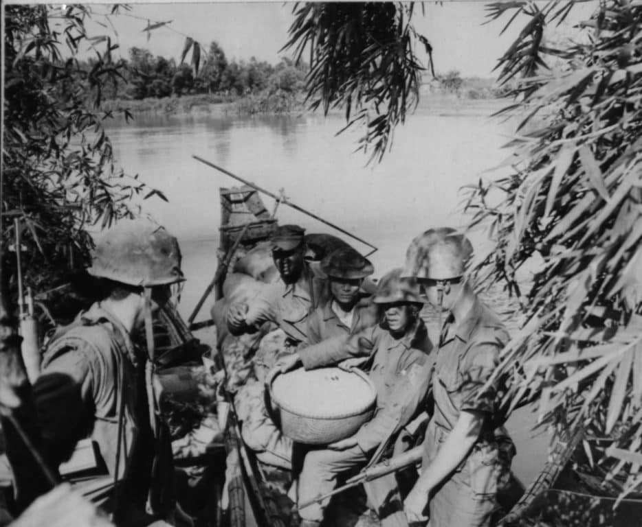 American Marines assist two Vietnamese Popular Force soldiers unloading rice from a small sampan. The rice was confiscated from a Viet Cong cache in the walls of a hut in Phu Bai village on Oct. 23, 1966. (Photo: U.S. Marine Corps Staff Sgt. Highland)