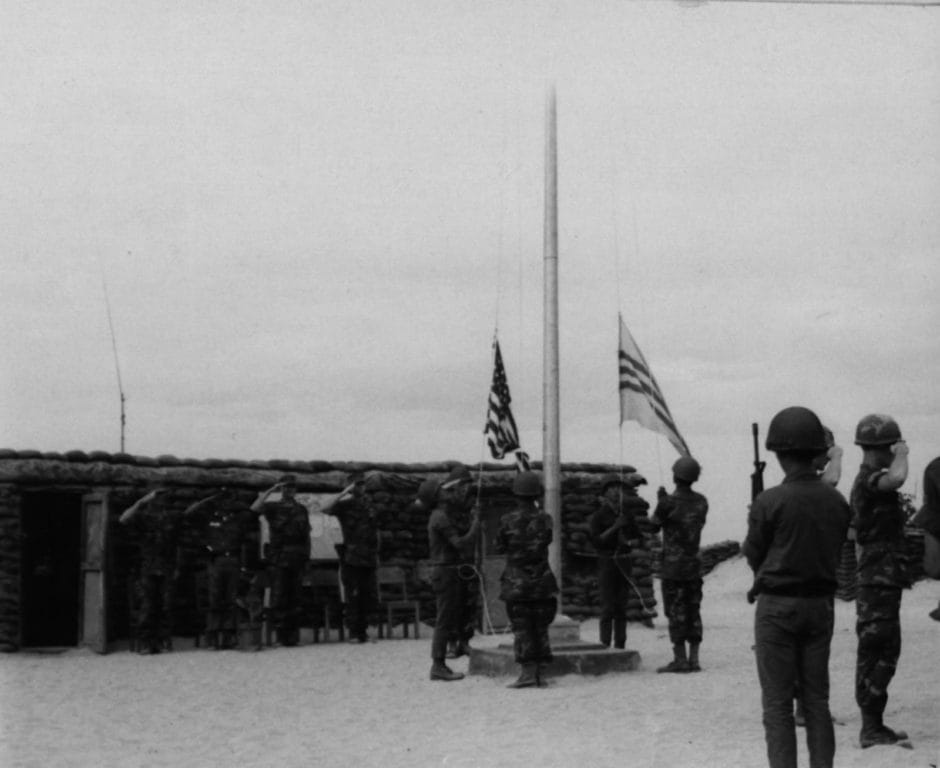 Marines and Popular Forces of TANGO-1 Combined Unit Pacification Program perform a joint flag raising ceremony in Le Soa Village on Sep. 3, 1970. (Photo: U.S. Marine Corps Cpl. R. F. Rappel)