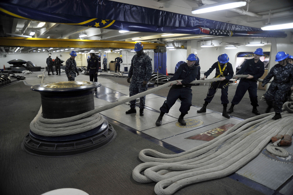 Sailors secure a line to the capstan while hoisting the anchor chain.