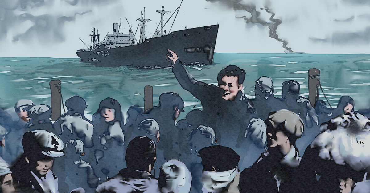 “The Koreans on the dock, to me, that’s what we were there for, that was our job. The problem was how we [were] going to get them aboard,” remembered Burley Smith, a Merchant Mariner, the third mate aboard the Meredith Victory. “There were too many people and not enough time to get them all loaded. It looked like Times Square on New Year’s Eve.”
