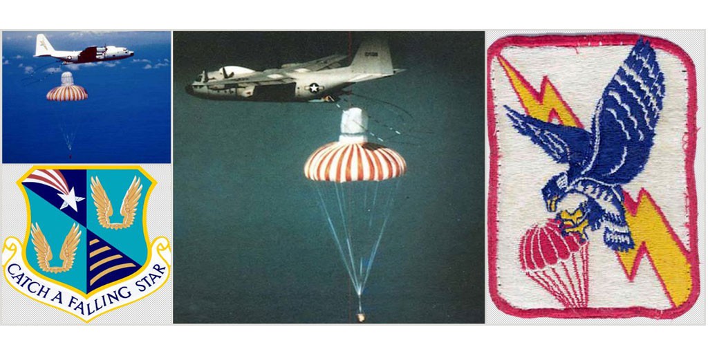 When they first entered the atmosphere, the canisters would resemble falling stars as the air around the fast-moving object compressed and began to burn. After the chute deployed, the canister slowed down and 6594th and 6593rd pilots would have to spot the canisters and snag them with a recovery system installed on modified cargo planes. They originally used the C-119 Flying Boxcar but switched over to C-130s.