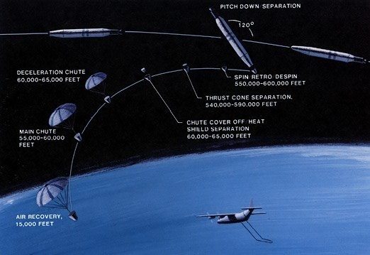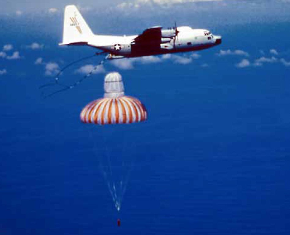 So, the Air Force set up the 6593rd Test Group and then the 6594th Test Squadron at Hickham Air Force Base, Hawaii. These units flew under the path of the satellites and caught the film that the satellites dropped to earth. Some of the first objects ever designed to re-enter the atmosphere, the canisters were about the size of a garbage can and carried large parachutes to slow their descent.