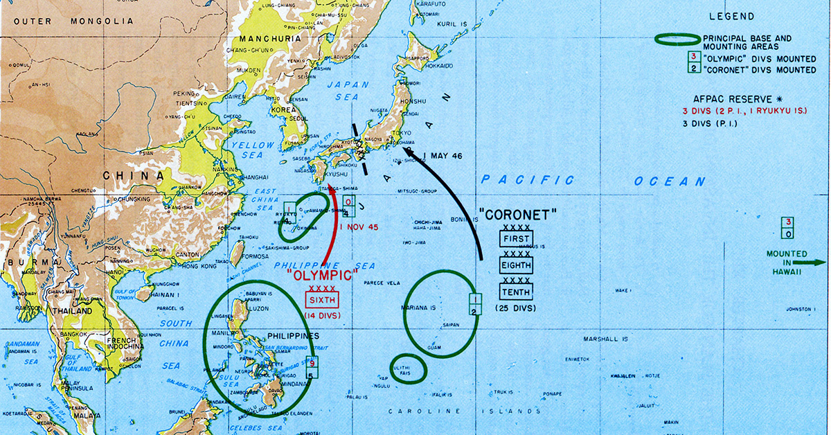 U.S. plans for Operation Downfall, the invasion of the Japanese home islands via two amphibious landings, one at Kyushu Island and one at Honshu.