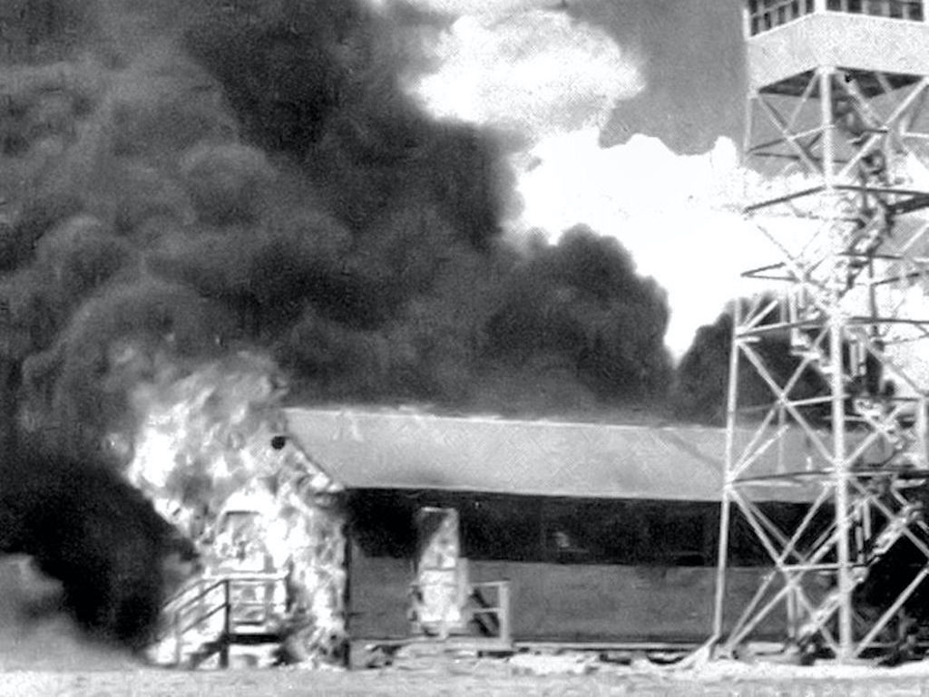 A fire breaks out on an Air Force base when bats were accidentally released in 1943. Image courtesy Wikimedia Commons.