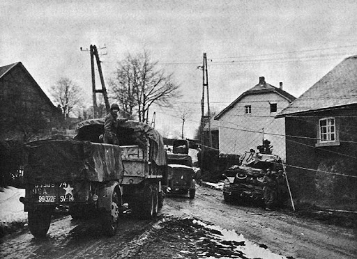 The German pre-dawn artillery bombardment on December 16th destroyed 3/395’s communication wires at Höfen, but the stunned soldiers soon witnessed an even more ominous sight: enemy searchlights, reflecting off the dense clouds, illuminated the snowy open ground east of Höfen. Through this eerie artificial moonlight, the 326th Volksgrenadier Division advanced on 3/395’s position.