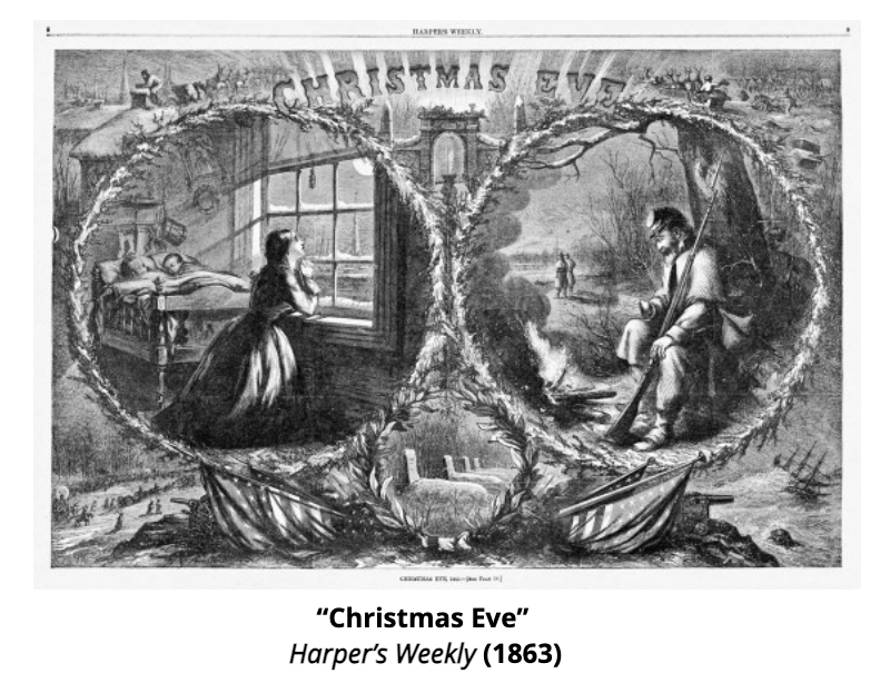 In Nast’s cartoons, he didn’t hesitate to make his political opinions known. He made his Union loyalties quite clear, and on January 3rd, 1863, Santa Claus helped send his message home. In a particularly festive piece of propaganda, Nast depicted Santa Claus decked out in stars and stripes handing out gifts to Union soldiers. If you look closely, you can see Union Santa clutching a puppet resembling the Confederate president, Jefferson Davis, with a rope around its neck. In a Christmas Eve version, Nast drew a jolly Santa Claus climbing down the chimney to deliver presents, while a woman in the next frame prays for her husband’s safe return.