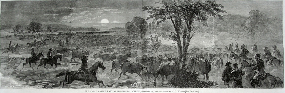 Confederate cavalrymen raid union livestock in the west in 1864. Guerrilla forces could often conduct missions like this, but had to be sure and melt away before Union forces caught them.