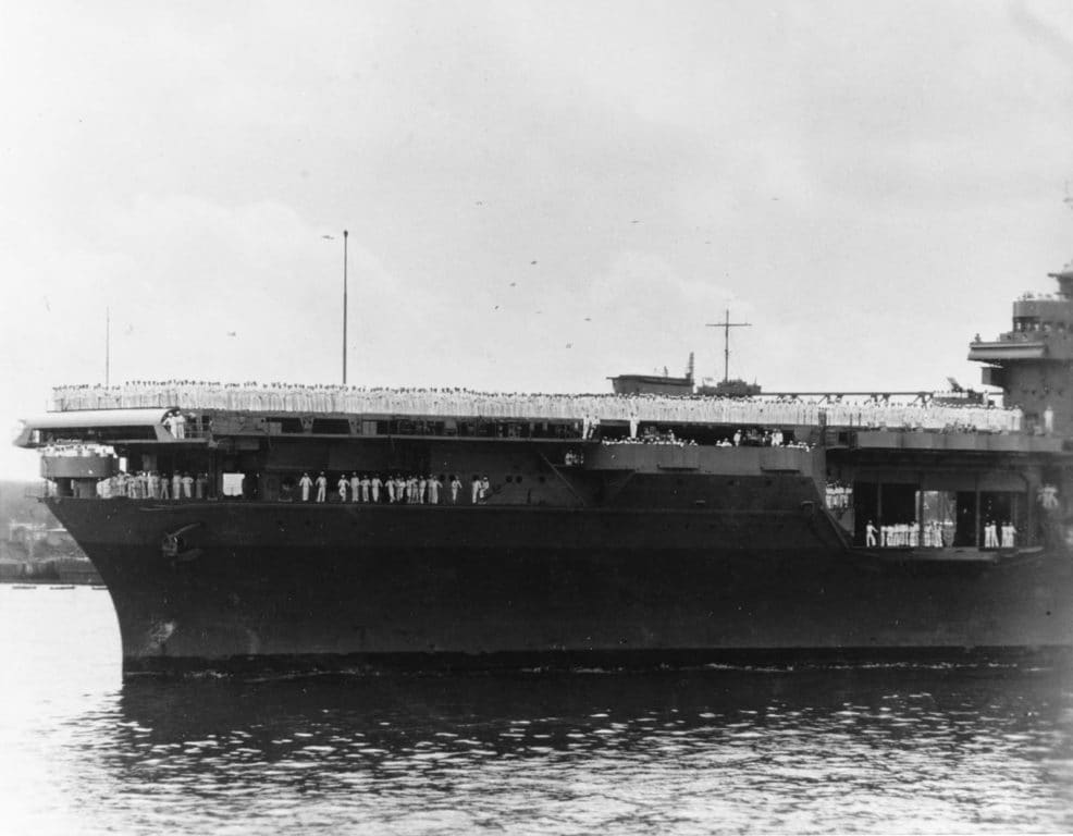 The Yorktown was one of America’s eight active carriers when the country formally entered World War II after the attack on Pearl Harbor. It was based in the Atlantic at the time of the attack, but was soon equipped with additional anti-aircraft weapons and sent to the Pacific where it became the flagship of Task Force 17.
