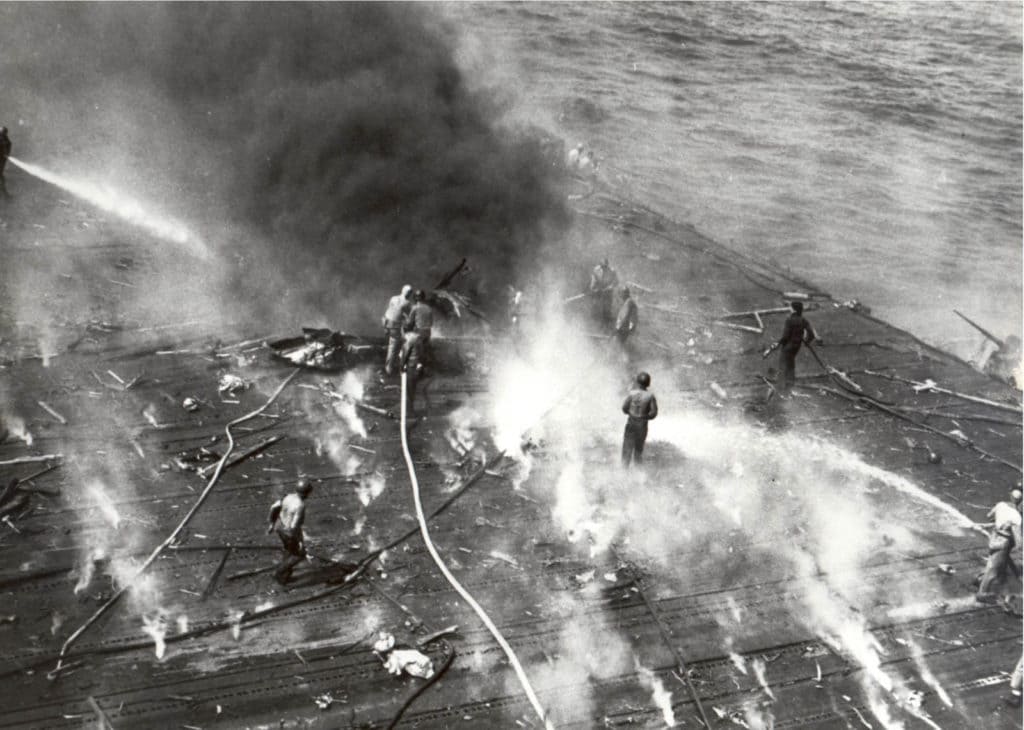The two flights rained dive bombs onto the Japanese carriers Kaga, Akagi, and Soryu. Recently fueled and re-armed Japanese planes on the decks went up in fireballs next to hoses and weapons strewn about the decks.