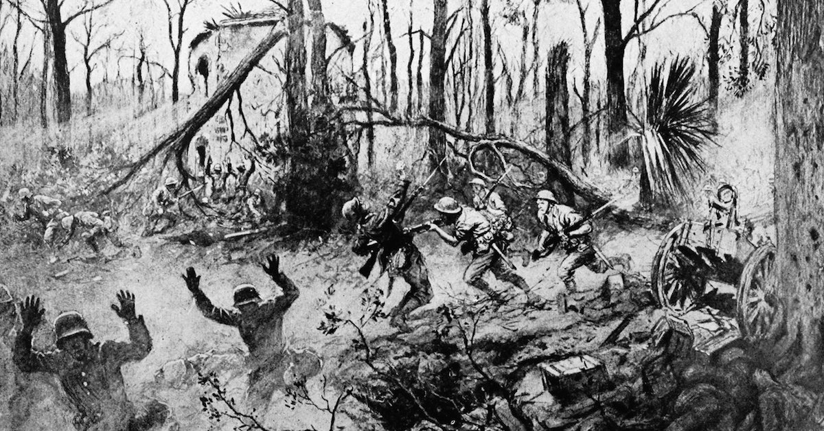 As Capt. George Wallace Hamilton and the 49th Company were getting into position, he noticed that they were surrounded by German machine guns — he had caught them off guard. He and his men stormed the guns with bayonets fixed and secured the guns for friendly forces.