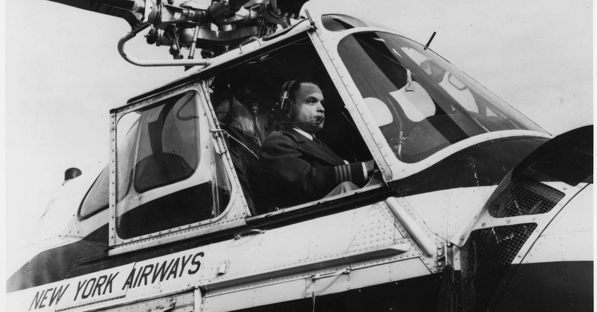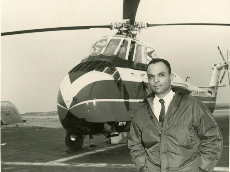 With Perry Young as the co-pilot, the 12-passenger helicopter rose three feet from the ground, hovered gently for a moment, then, pointing its snub-nose down, soared straight up from LaGuardia Airport. In nine easy “bumpless” minutes we were at Idlewild… Perry Young is unique because he is the first Negro pilot hired by any scheduled airline in America.