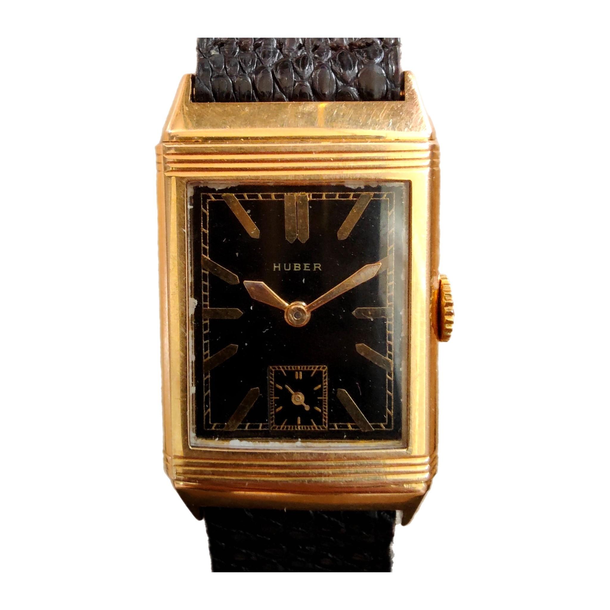 The watch in question is a reversible type famously associated with the legacy watchmaker LeCoultre. Originally designed for polo players, the watch face can be reversed to protect it during play. While the watch movement was made by LeCoultre, the case was produced by a subcontractor. Markings on the watch indicate that it was manufactured in Switzerland and imported into Germany where its gold construction was validated again.